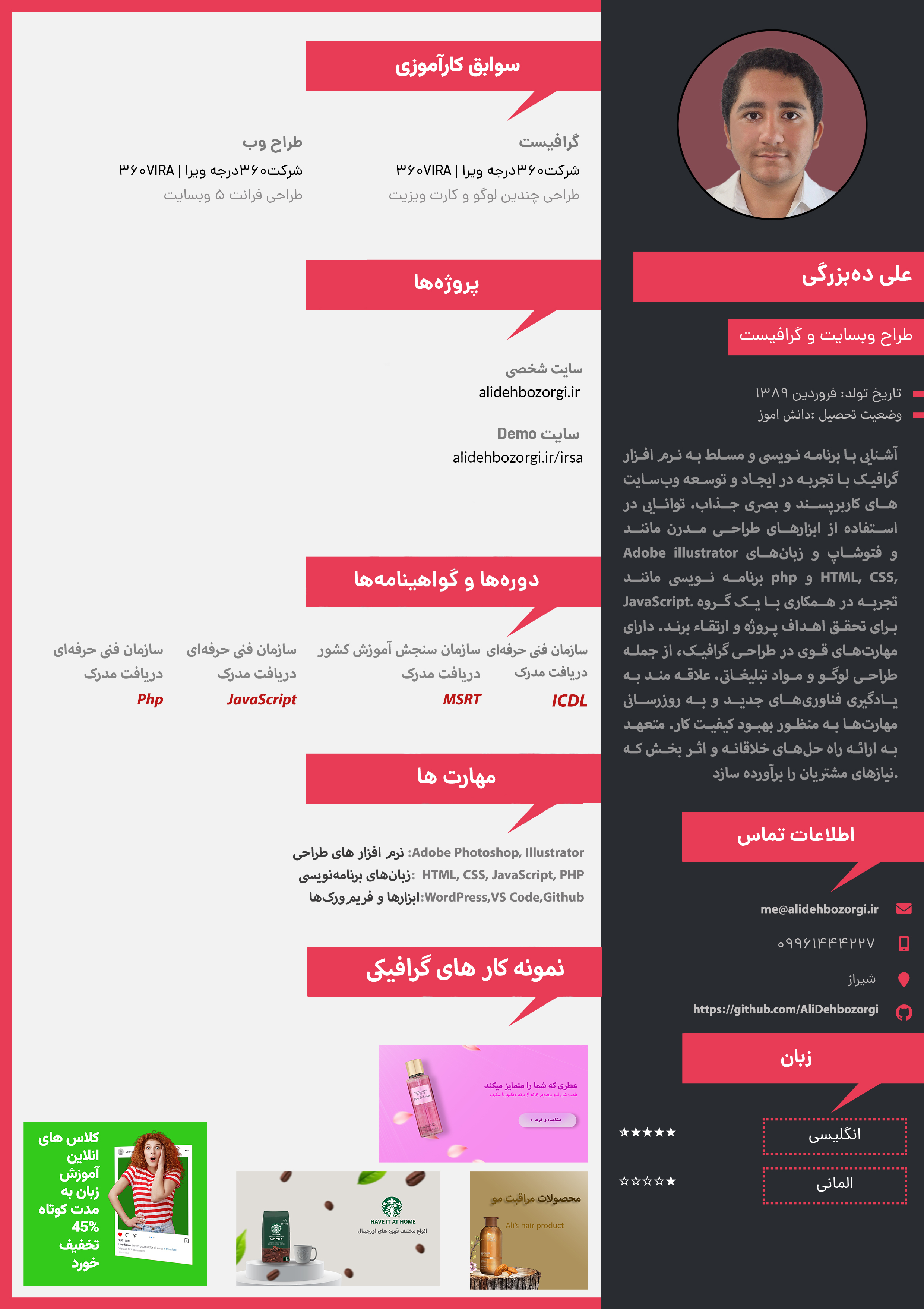 من طراح و توسعه‌دهنده وب و یک گرافیست هستم، دارای مدرک ICDL و مدرک زبان MSRT. به نرم‌افزارهای Photoshop و Illustrator تسلط دارم و در برنامه‌نویسی وب با HTML، CSS، JavaScript، PHP، Bootstrap و همچنین کار با GitHub تجربه دارم. تاکنون بیش از ۵ پروژه وب و چندین پروژه گرافیکی مانند طراحی لوگو و کارت ویزیت انجام داده‌ام.